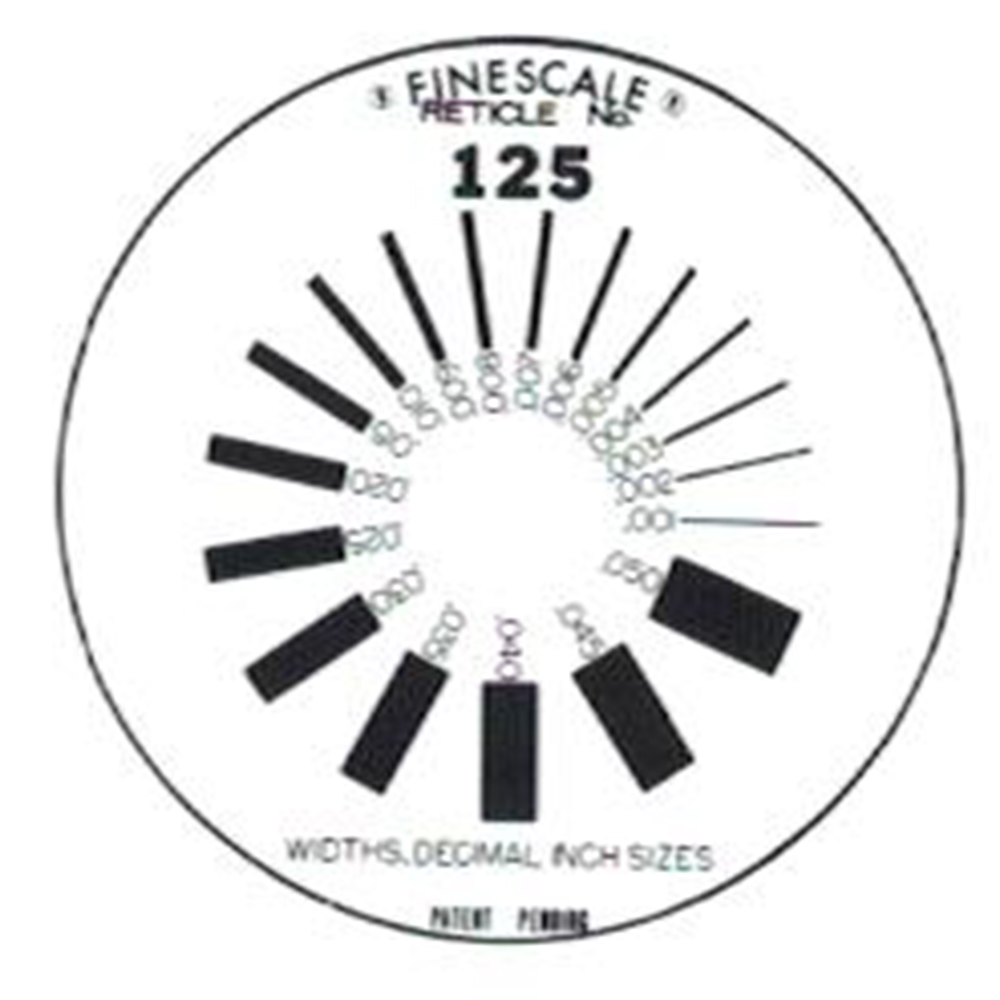 Reticle 125: Widths, Decimal inch sizes. Eighteen sizes, .001" to .050". Used in checking the width of drawn or scribed lines, slots, etc. Compare with No. 140.